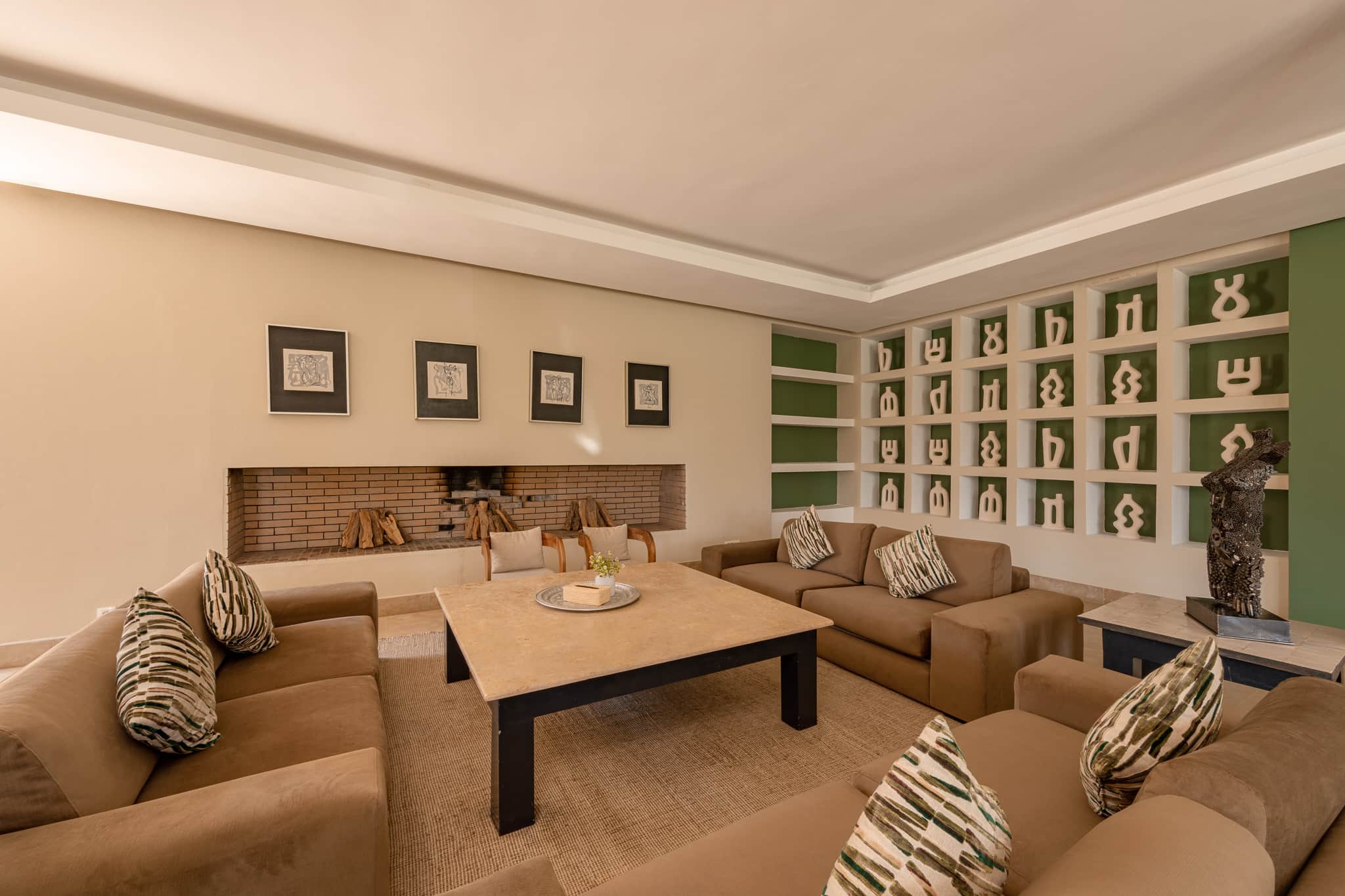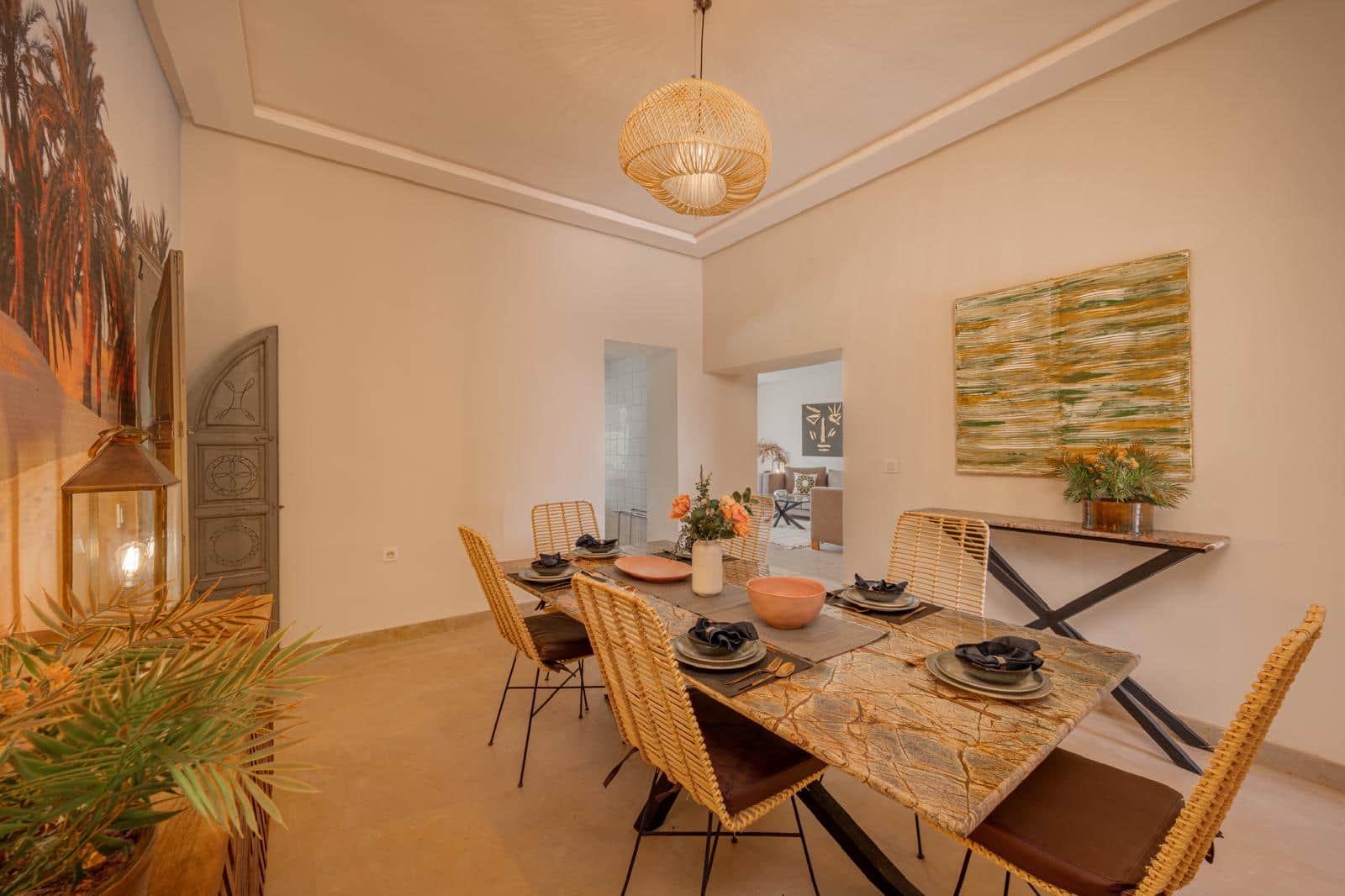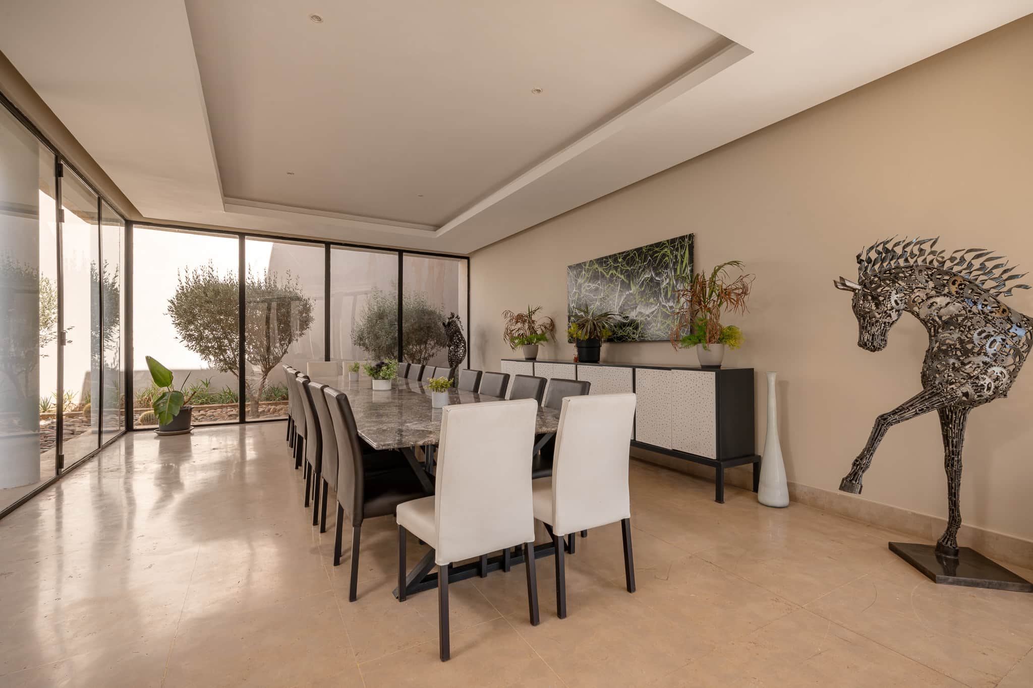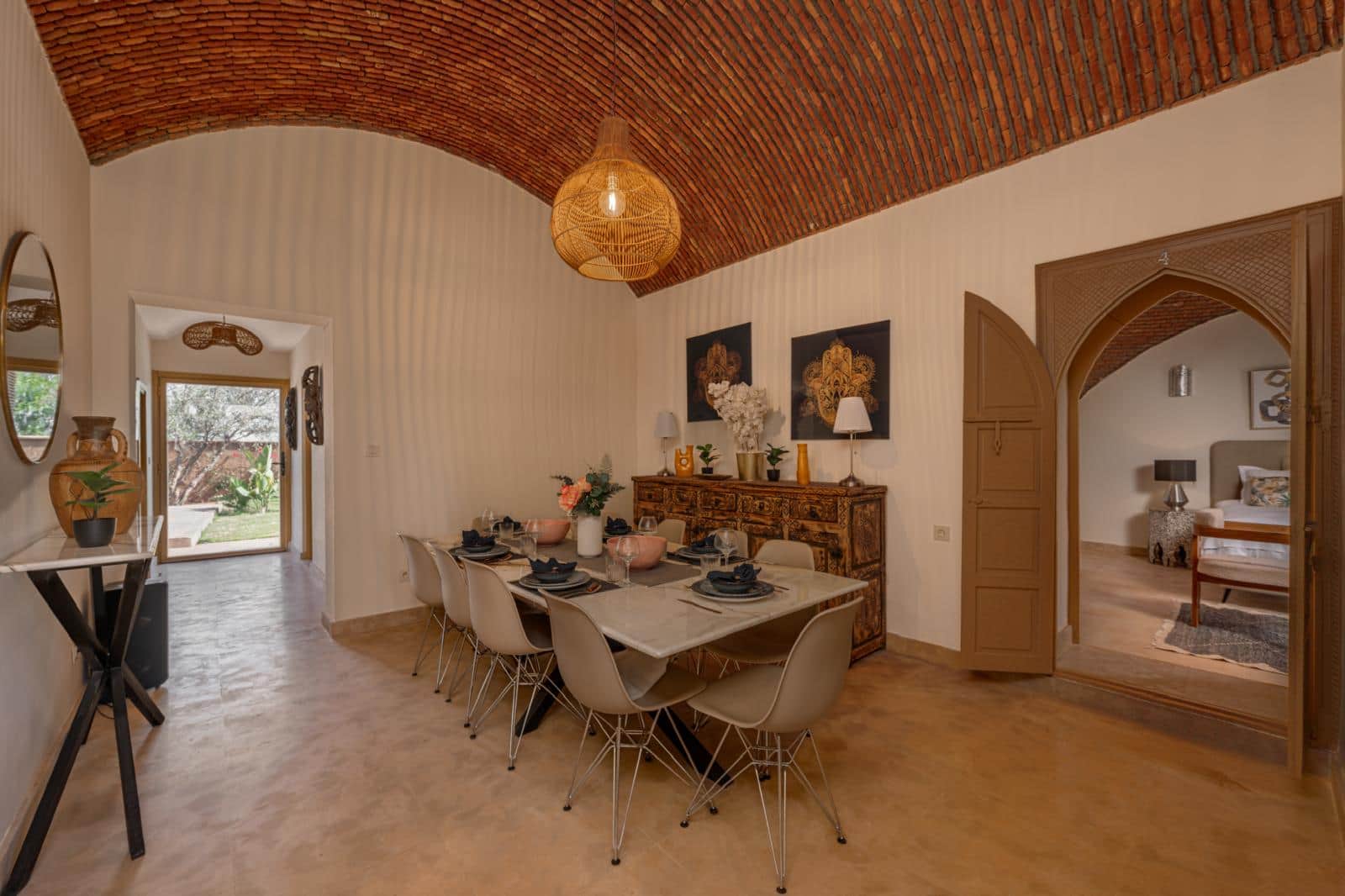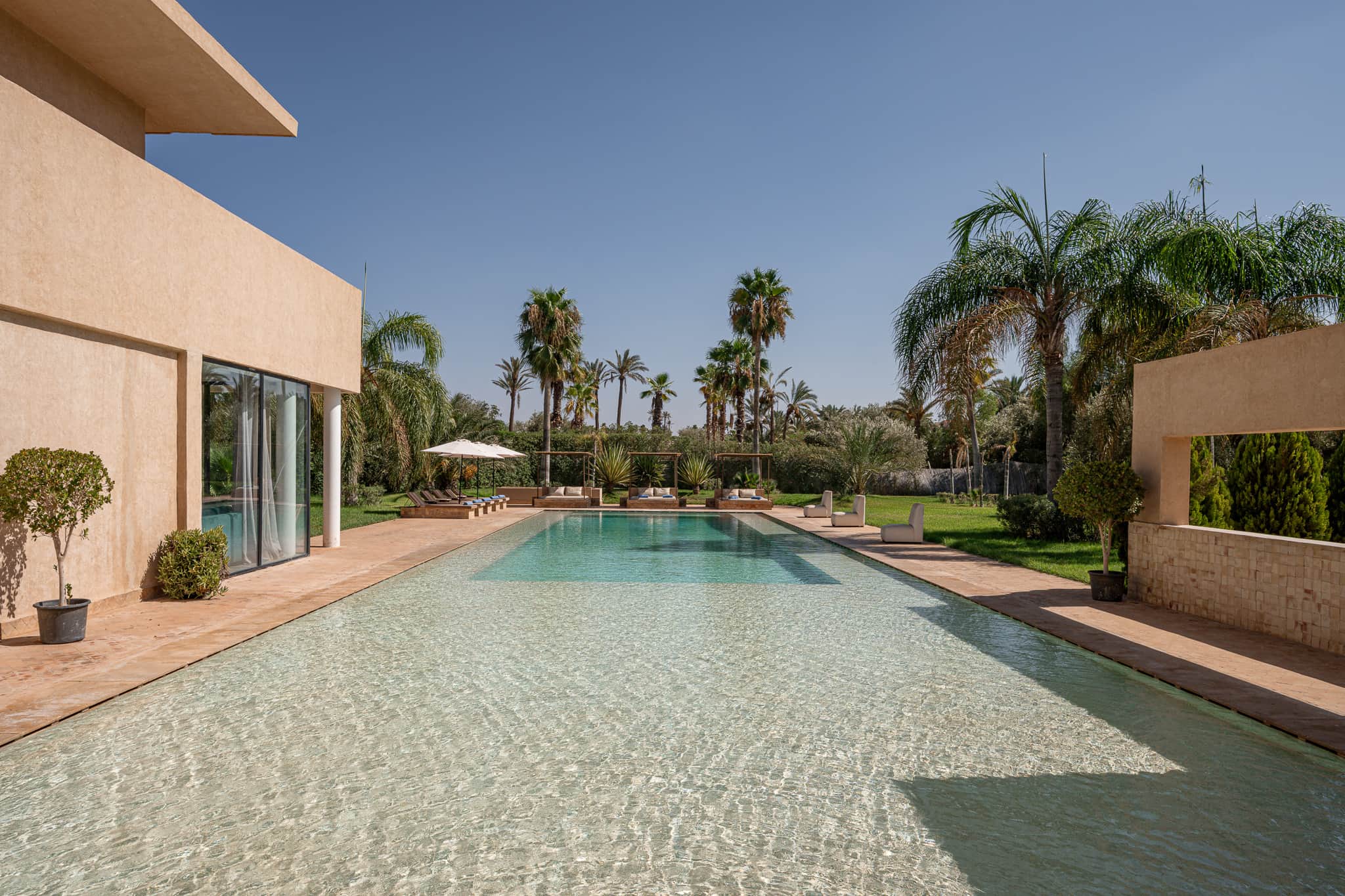 Organisée autour d’une piscine majestueuse s’étendant au milieu d’un jardin luxuriant, la villa allie authenticité marocaine et élégance contemporaine. Ses intérieurs spacieux et lumineux, décorés avec raffinement, créent une atmosphère propice à la détente et au partage.